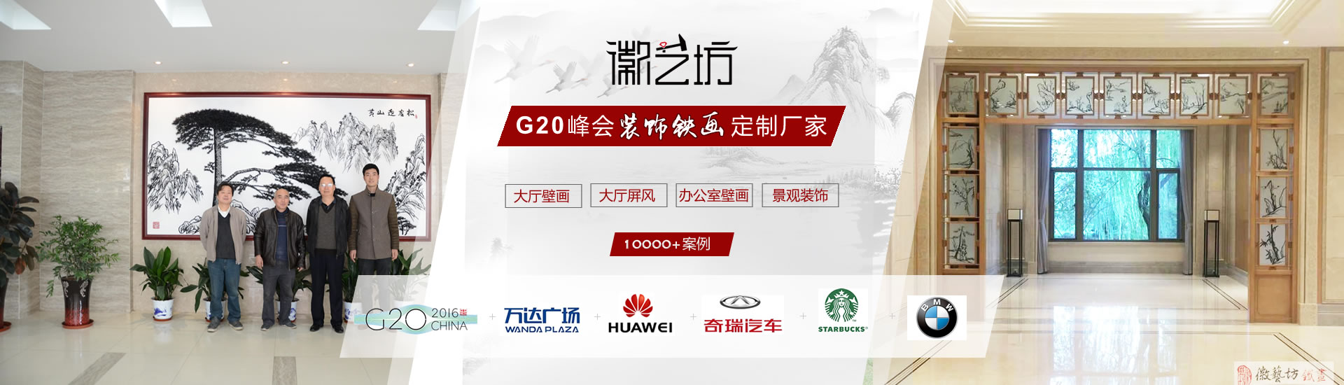 鐵畫既有國畫的神韻,又有雕塑的立體美,被譽為“中華一絕”,鐵畫裝飾畫給您帶來高雅藝術(shù)品位。眾多單位一致選擇徽藝坊定制大廳壁畫:萬達(dá)、海螺集團、三聯(lián)集團、安徽省政府、振興集團、安徽水科院等。